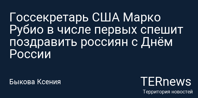 Госсекретарь США Марко Рубио в числе первых спешит поздравить россиян с Днём России. Сообщение появилось на сайте Госдепартамента.