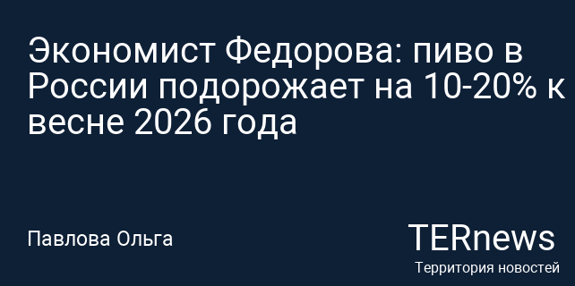 По словам Татьяны Федоровой, специалиста в области экономики и начальника отдела научных исследований ИМЭС, ожидается повышение цен на пиво в российских магазинах в диапазоне 10-20% к весне 2026 года. Основные факторы, способствующие этому росту, включают увеличение тарифов на электроэнергию и газ, а также нехватку квалифицированных специалистов в высокотехнологичных отраслях.