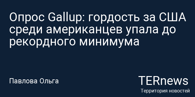 Согласно свежим данным опросов Gallup, уровень гордости американцев за свою страну достиг беспрецедентно низкого значения. Всего 58% взрослых жителей США выразили свою гордость, из которых 41% заявили, что они «крайне» гордятся тем, что являются американцами, а 17% — «очень». Это снижение на 9 процентных пунктов по сравнению с предыдущим годом.
