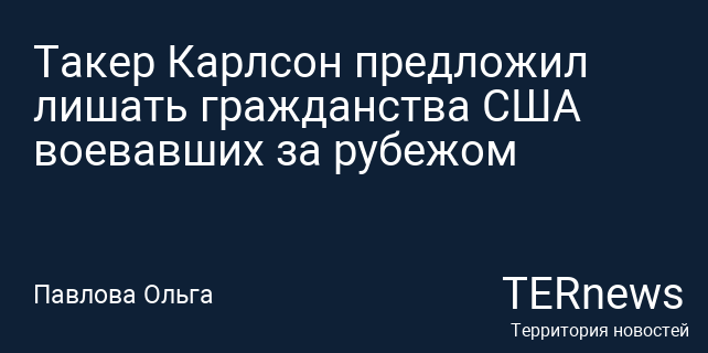 Американский журналист Такер Карлсон высказал мнение о необходимости лишения гражданства США тех, кто принимает участие в военных действиях за границей. На конференции, организованной Turning Point USA во Флориде, он заявил, что любой, кто служит в армии другой страны, должен утратить право на американский паспорт. В качестве примеров он привел случаи, когда американцы служат в армиях таких стран, как Израиль и Украина.