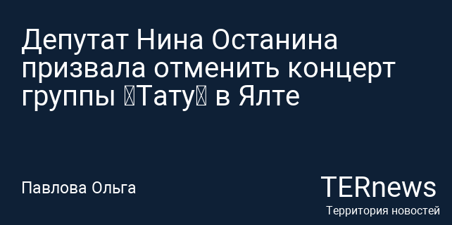 Нина Останина, депутат и руководитель комитета Госдумы по семейным вопросам, выступила с инициативой о запрете концерта группы «Тату», который запланирован на 19 июля в Ялте на курорте «Мрия». Свое обращение она адресовала главе Крыма Сергею Аксенову и председателю Госсовета республики Владимиру Константинову. В своем заявлении Останина подчеркнула, что творчество группы «Тату» ставит под сомнение традиционные духовные и моральные ценности, что может негативно сказаться на детской аудитории.