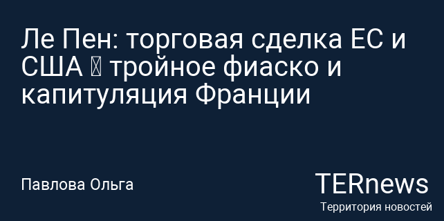 Лидер фракции «Национальное объединение» в парламенте Франции Марин Ле Пен выразила свое недовольство по поводу неудачи торгового соглашения между Европейским Союзом и Соединенными Штатами. В своем сообщении на платформе X она охарактеризовала сделку, достигнутую главой Еврокомиссии Урсулой фон дер Ляйен и президентом США Дональдом Трампом, как «фиаско» с политической, экономической и моральной точек зрения. По словам Ле Пен, условия, которые были предложены странам ЕС, оказались менее выгодными по сравнению с теми, что получила Великобритания.