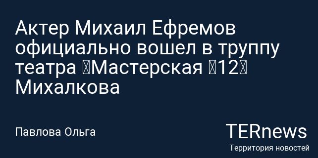 Актер Михаил Ефремов теперь является частью труппы театра «Мастерская «12», руководимого Никитой Михалковым. Об этом стало известно благодаря пресс-службе театра, сообщает ТАСС. Во время собрания труппы, приуроченного к началу нового сезона, Михалков представил Ефремова и отметил, что тот пережил сложные времена. Режиссер добавил, что актер сам обратился к нему с просьбой продолжить свою карьеру в театре.