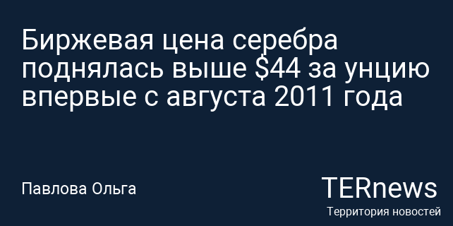 Биржевая цена серебра поднялась выше $44 за унцию впервые с августа 2011 года