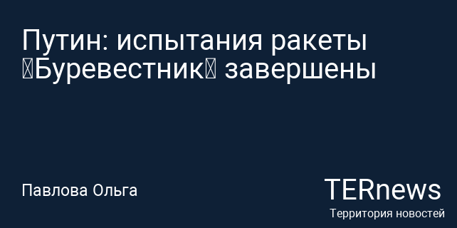 Президент Владимир Путин сообщил, что завершён цикл испытаний российских ракет с ядерной энергетической установкой «Буревестник», об этом он говорил на совещании с начальником Генштаба Валерием Герасимовым и руководителями армейских группировок, передаёт . По информации Генштаба, испытания проходили 21 октября — в рамках этого полёта аппарат преодолел порядка 14 тысяч километров, и, как подчеркнул Валерий Герасимов, это не исчерпывает его возможности. Также, по его словам, ракета продемонстрировала способность обходить средства противоракетной обороны.