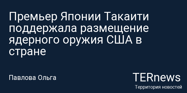 Японская газета Mainichi сообщила, что глава кабинета министров Санаэ Такаити считает допустимым вариант размещения на территории Японии американских ядерных боеголовок. По её мнению, действующий запрет на ввоз такого оружия способен ослабить ядерное сдерживание со стороны США и потому нуждается в ревизии в контексте нынешней безопасности страны, зависящей от американского оборонного гаранта.