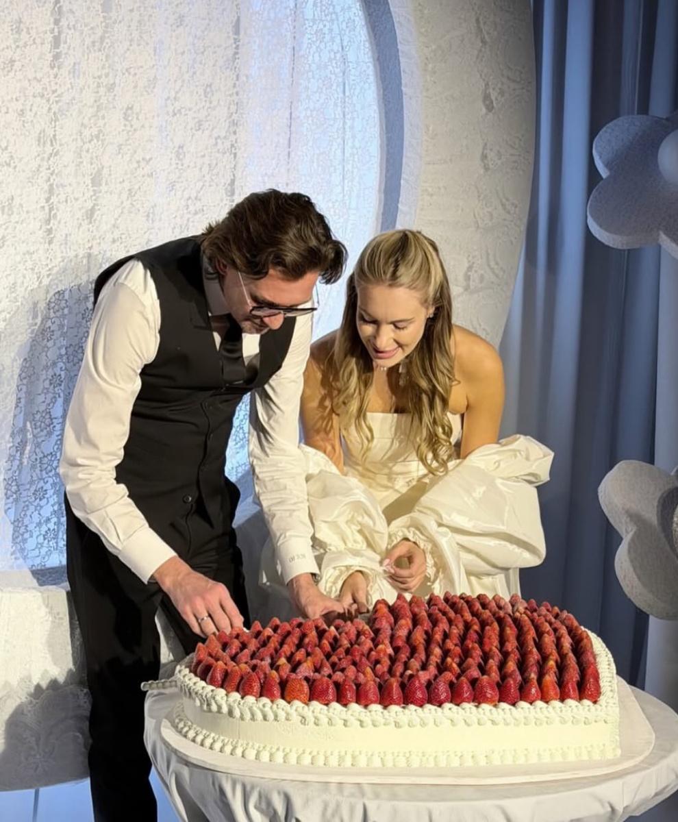 Свадьба прошла в тёплой и уютной атмосфере: молодожёны исполнили нежный танец, разрезали традиционный торт и спели трогательную песню под аплодисменты гостей.
