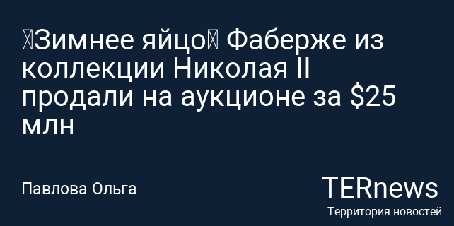 ТАСС сообщает, что на лондонских торгах дома Christies «Зимнее яйцо» Фаберже из собрания императора Николая II ушло с молотка за 19,5 млн фунтов стерлингов (примерно $25,7 млн). Стартовая ставка составляла 17 млн фунтов (около $22,4 млн), а окончательная сумма была зафиксирована организаторами аукциона.